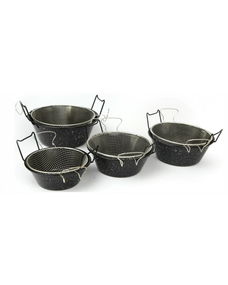 Fritadeira com rede em esmalte preto e branco, diâmetro de 20 cm, para fogões de gás.
